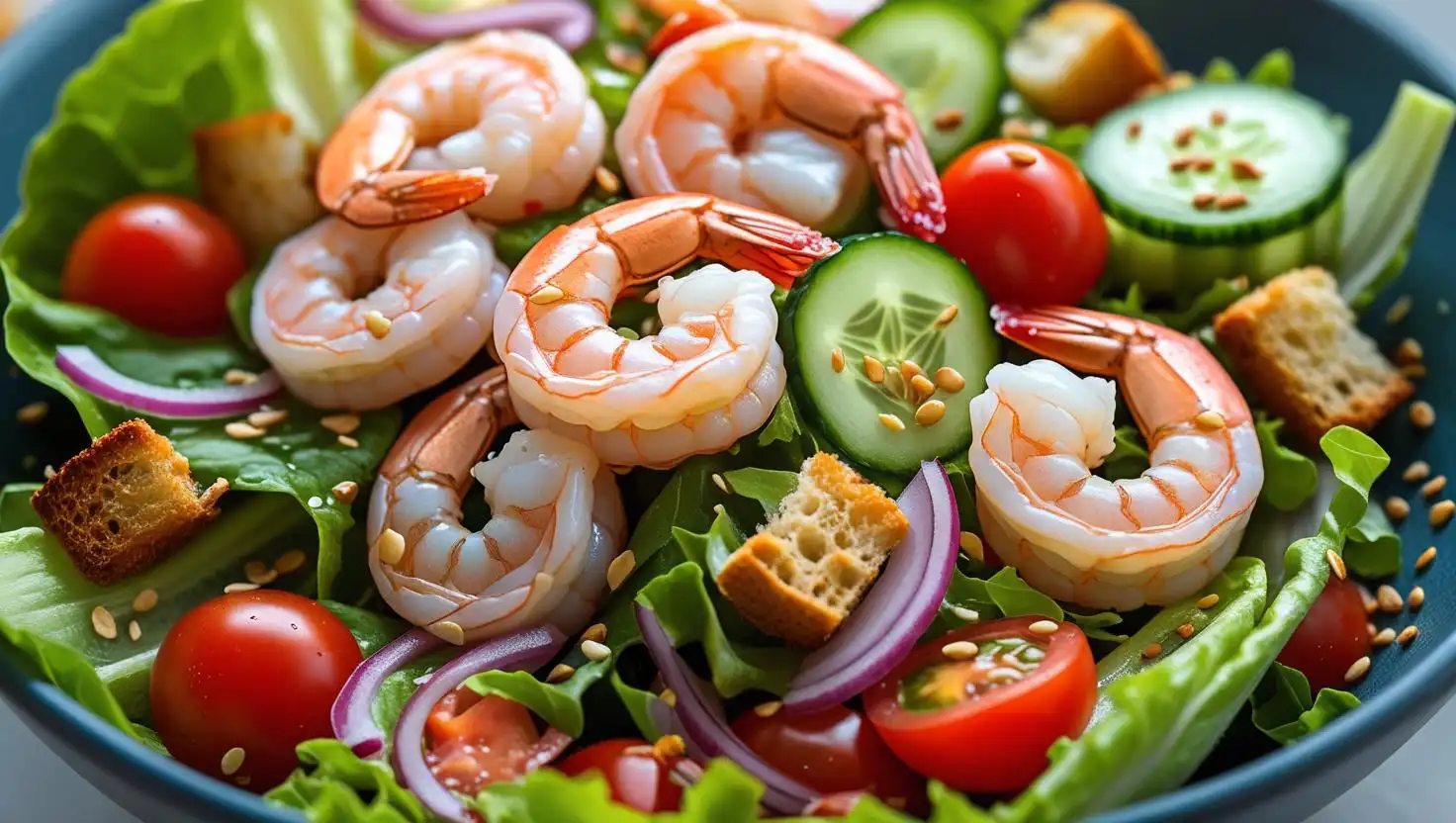 mix sałat, winegret, krewetki, pomidorki koktajlowe, ogórek świeży, czerwona cebula, sezam, grzanki
